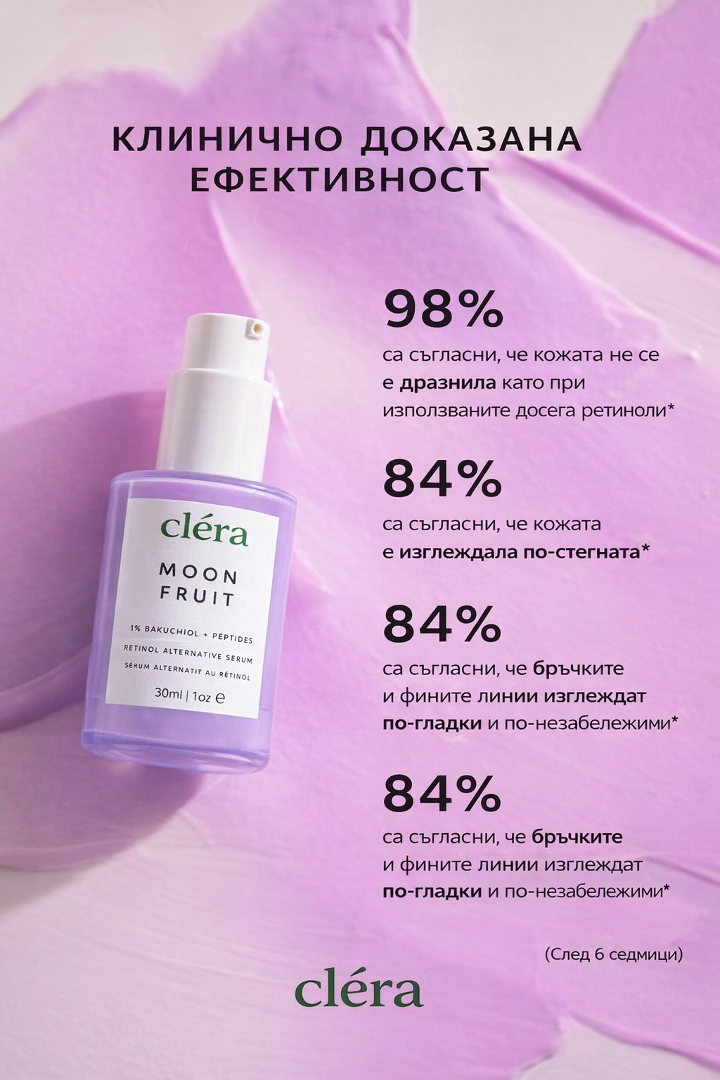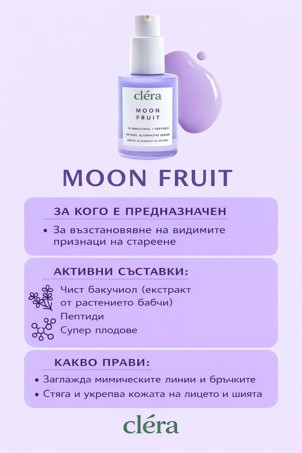 Cléra Moon Fruit Серум атакува бръчките, умората и загубата на еластичност още от първите седмици. С мощна формула с 1% бакучиол и пептиди, той изглажда, стяга и връща младежкия вид на кожата – без дразнене и без компромиси.